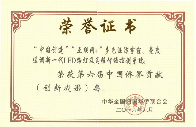 我司研發(fā)制造的“中國創(chuàng)造”“互聯(lián)網(wǎng)+”多色溫防霧霾、亮度遙調(diào)新一代LED路燈及遠(yuǎn)程智能控制系統(tǒng)于2016年9月榮獲第六屆中國僑界貢獻(xiàn)(創(chuàng)新成果)獎(jiǎng)。